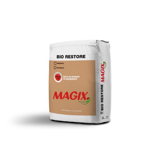 BIO RESTORE INTONACO è una malta secca composta calce idraulica naturale NHL 3,5,leganti idraulici, inerti calcarei puri e selezionati ,fibre in poliacronilite ed additivi specifici che ne migliorano le caratteristiche di lavorabilità e prestazionali